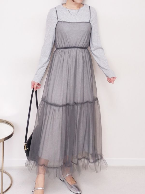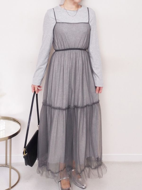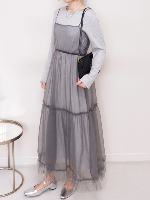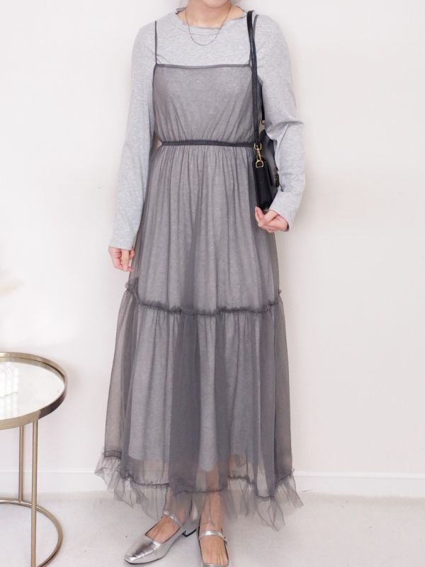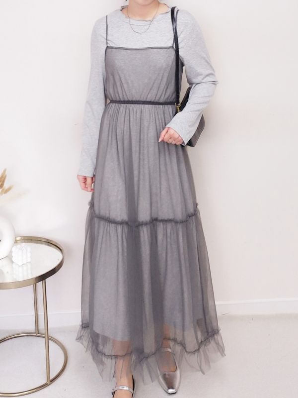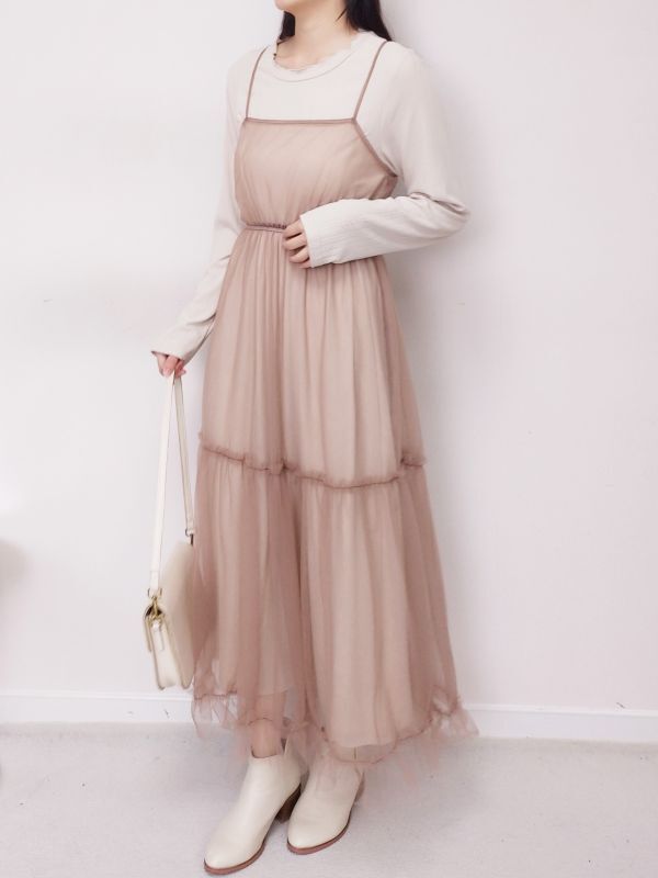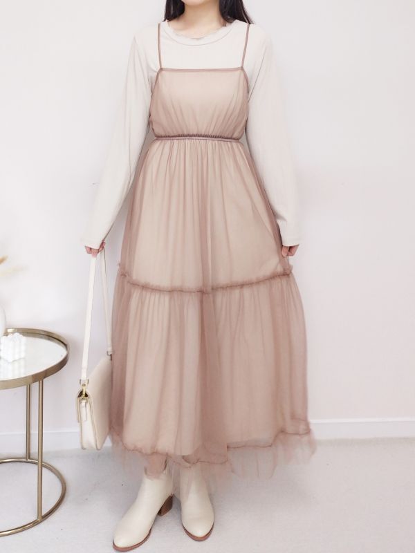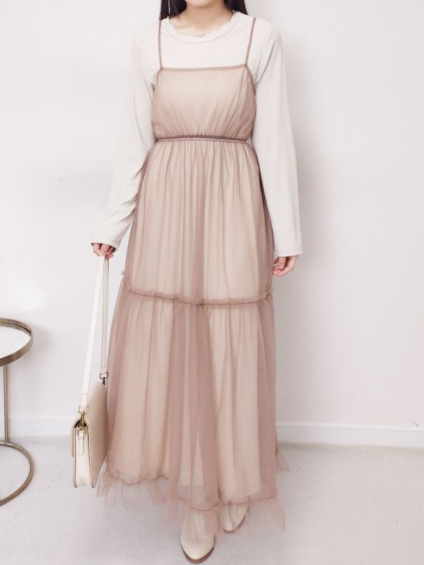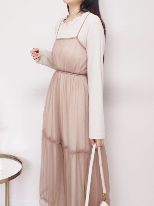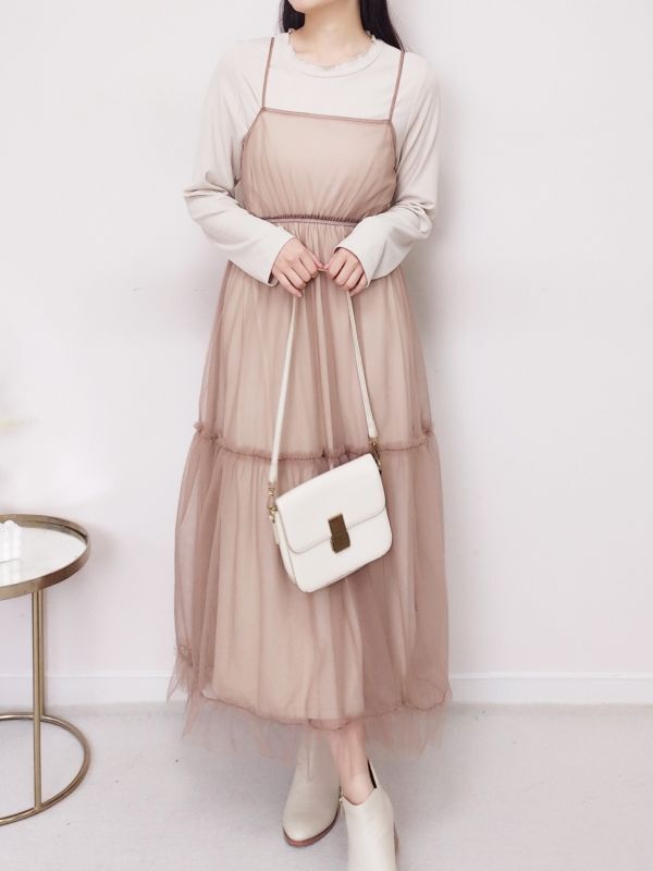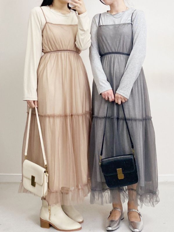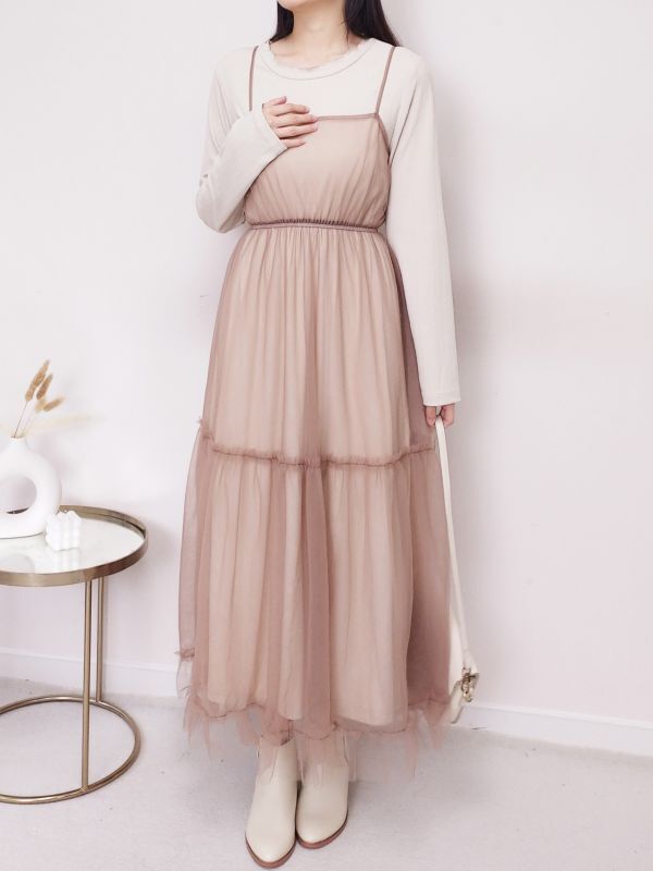 捲邊直紋兩件式網紗細肩洋裝/兩色