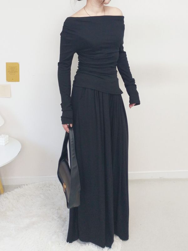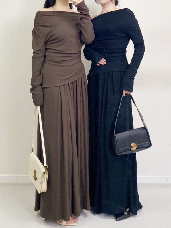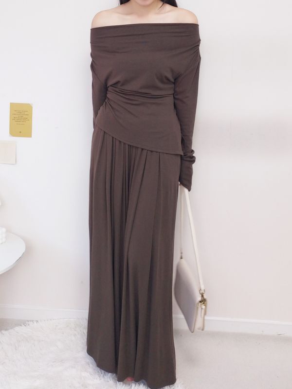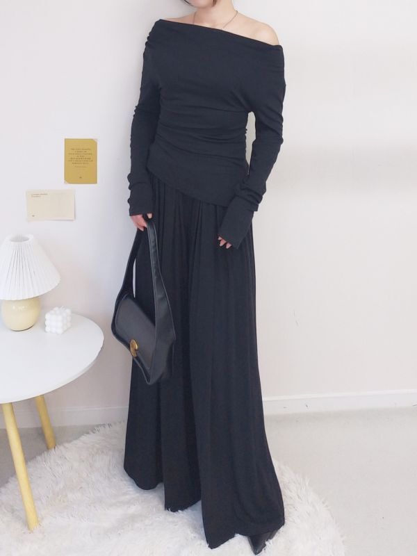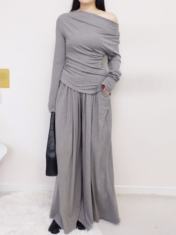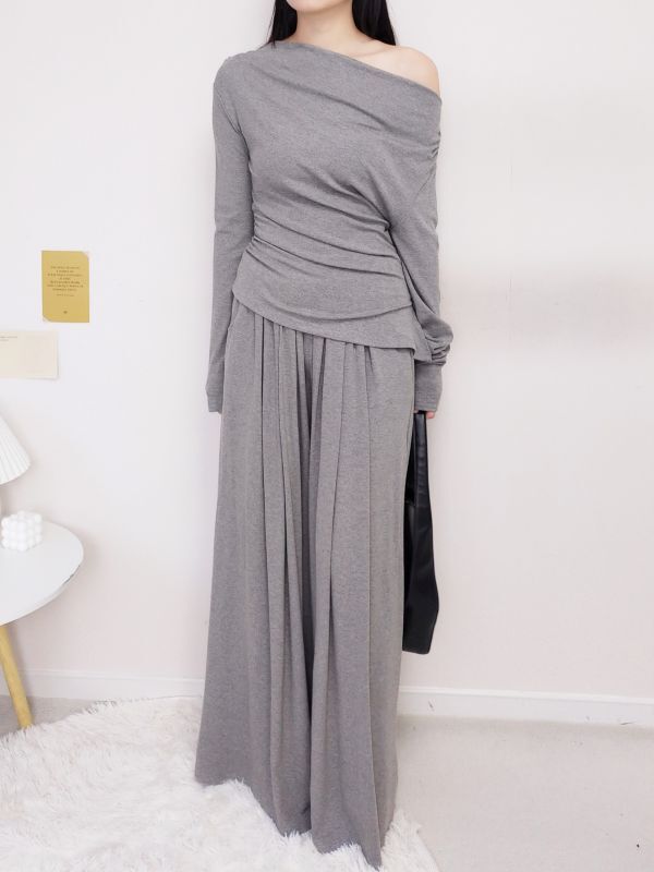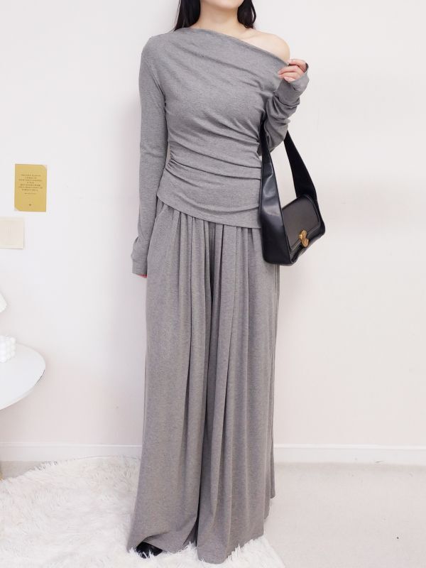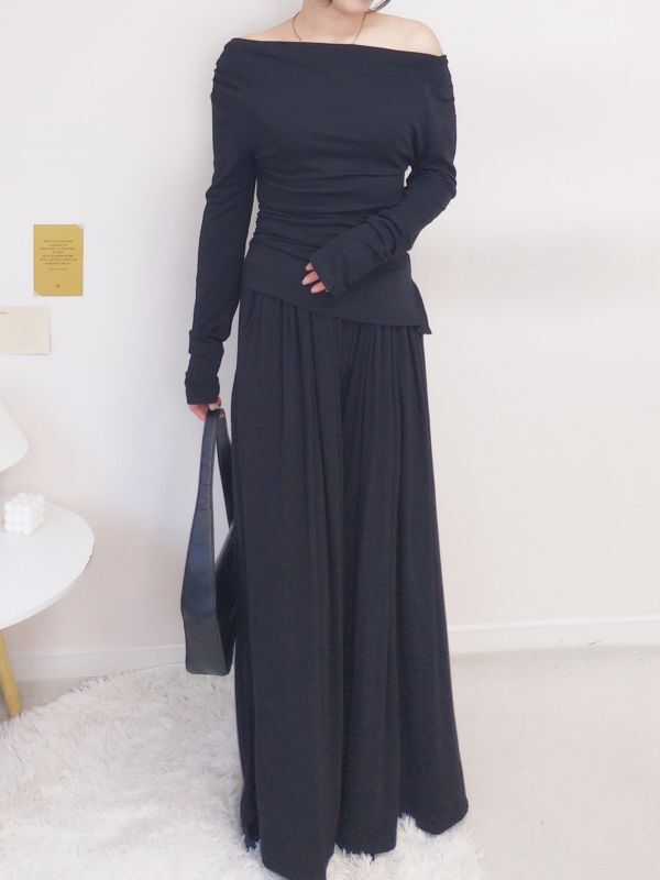 一字領側腰抓皺寬褲套裝/三色