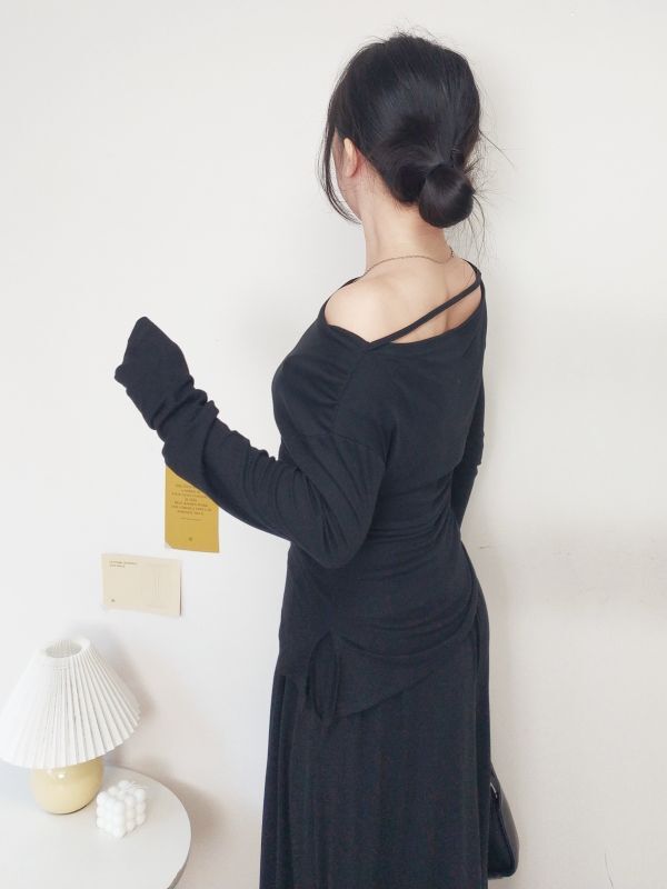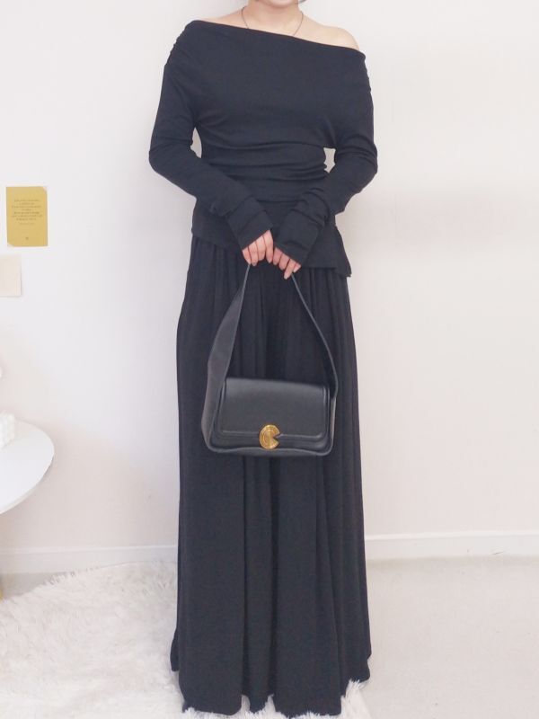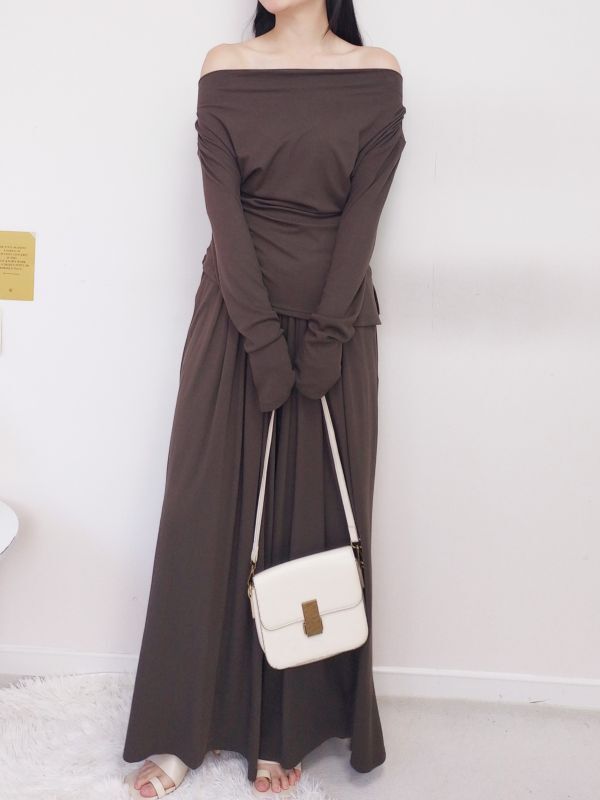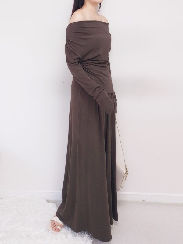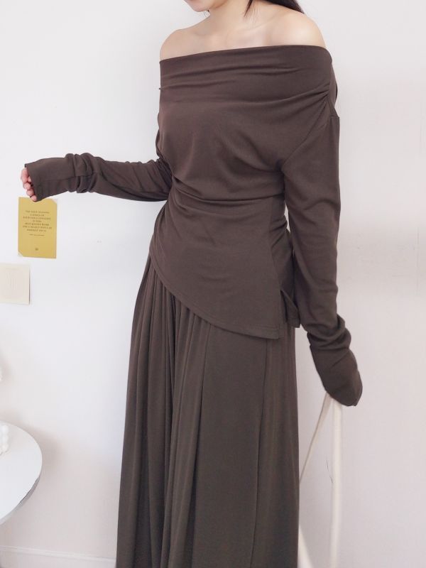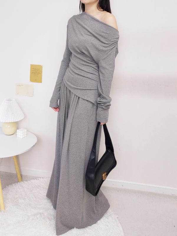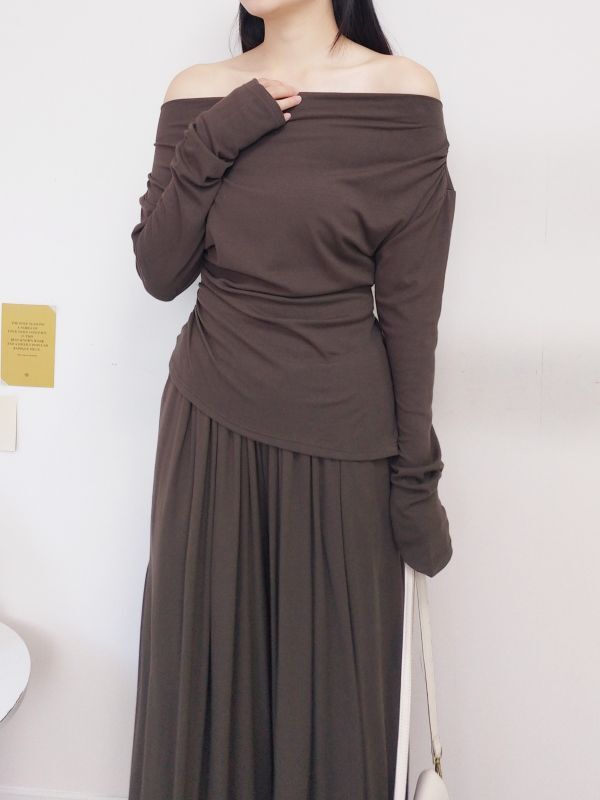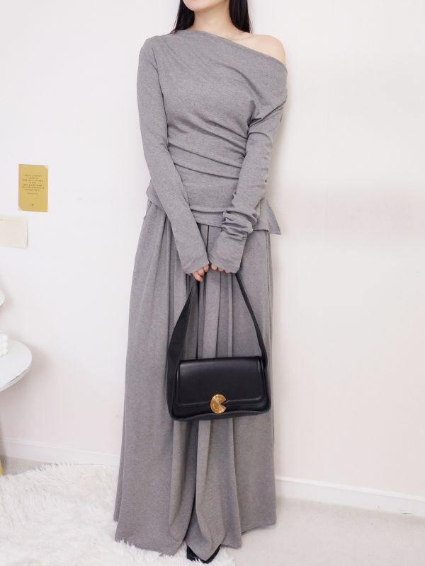 一字領側腰抓皺寬褲套裝/三色